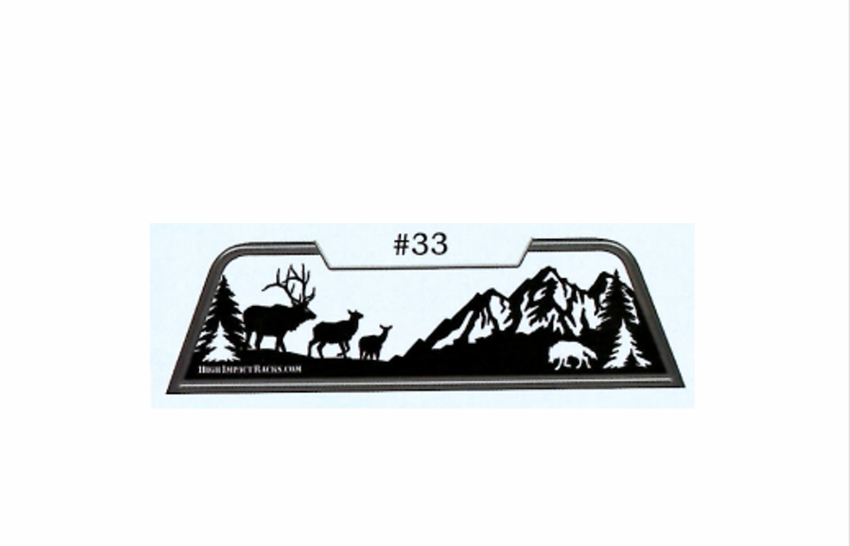 Showcase the beauty of mountain wildlife with our Alpine Wildlife #033 back window rack. Expertly crafted from 1/8″ steel and framed with 1 1/2″ tubing, this design features a majestic elk leading a group of deer, with rugged mountain peaks and a roaming bear in the background. Perfect for hunters, outdoor enthusiasts, and nature lovers,…