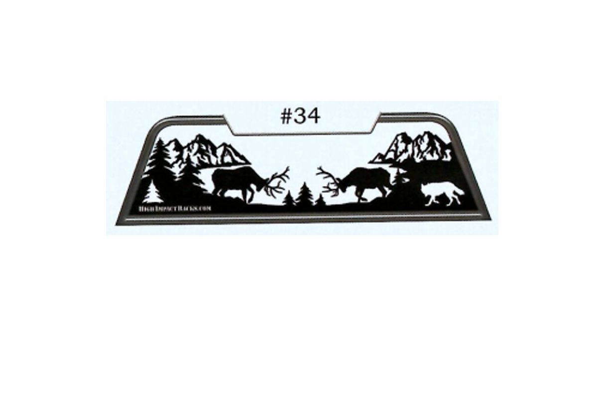 Capture the raw power of the wilderness with our Elk Battle #034 back window rack. Precision-cut from 1/8″ steel and framed with 1 1/2″ tubing, this design showcases two mighty elk locking antlers in a dramatic showdown, set against towering pine trees and rugged mountain peaks. A lone wolf observes the battle from a distance, adding to the untamed atmosphere of the scene. Perfect for hunters, outdoor enthusiasts, and those who respect the fierce beauty of nature, this rack makes a bold and striking addition to any truck.