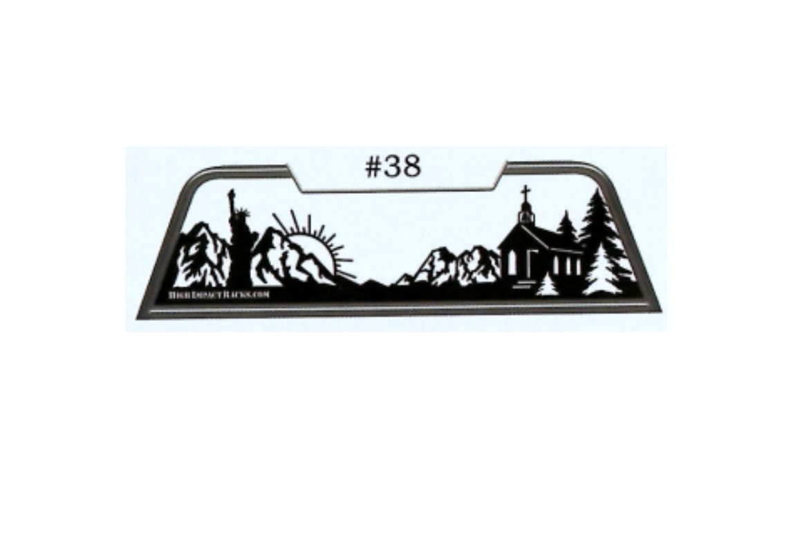 Celebrate the values of faith and freedom with our Faith & Freedom #038 back window rack. Precision-cut from 1/8″ steel and framed with 1 1/2″ tubing, this design features the Statue of Liberty, a breathtaking mountain sunrise, and a peaceful country church nestled among towering pines. Perfect for patriots, believers, and those who cherish the…