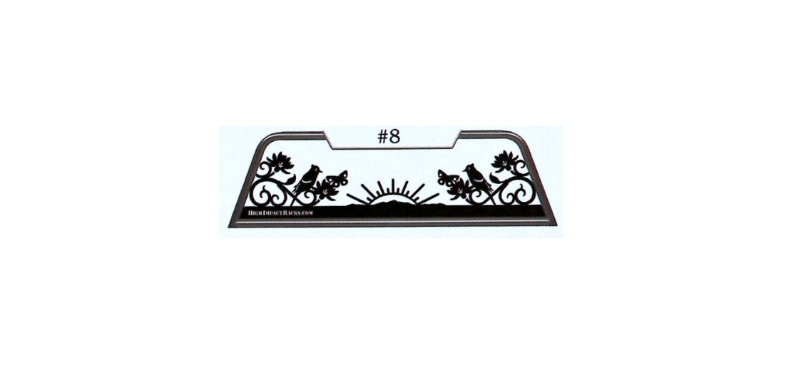Bring a touch of nature’s serenity to your daily travels with our Garden Harmony #008 back window rack. This design is intricately cut from 1/8″ steel and framed by 1 1/2″ tubing, showcasing durability and fine craftsmanship. It features a harmonious garden scene with birds perched among flourishing flowers and butterflies, under a rising sun.…