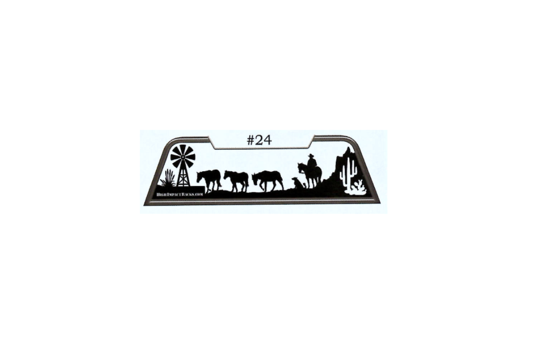Celebrate the beauty of the open range with our Ranch Sunset #024 back window rack. Precision-cut from 1/8″ steel and reinforced with 1 1/2″ tubing, this design showcases a cowboy on horseback watching over a group of grazing horses, accompanied by a loyal ranch dog. A windmill, desert cacti, and rugged mountain scenery complete the scene, embodying the tranquility and tradition of ranch life. Perfect for those who love the Western lifestyle, this rack is a bold and artistic addition to any truck.