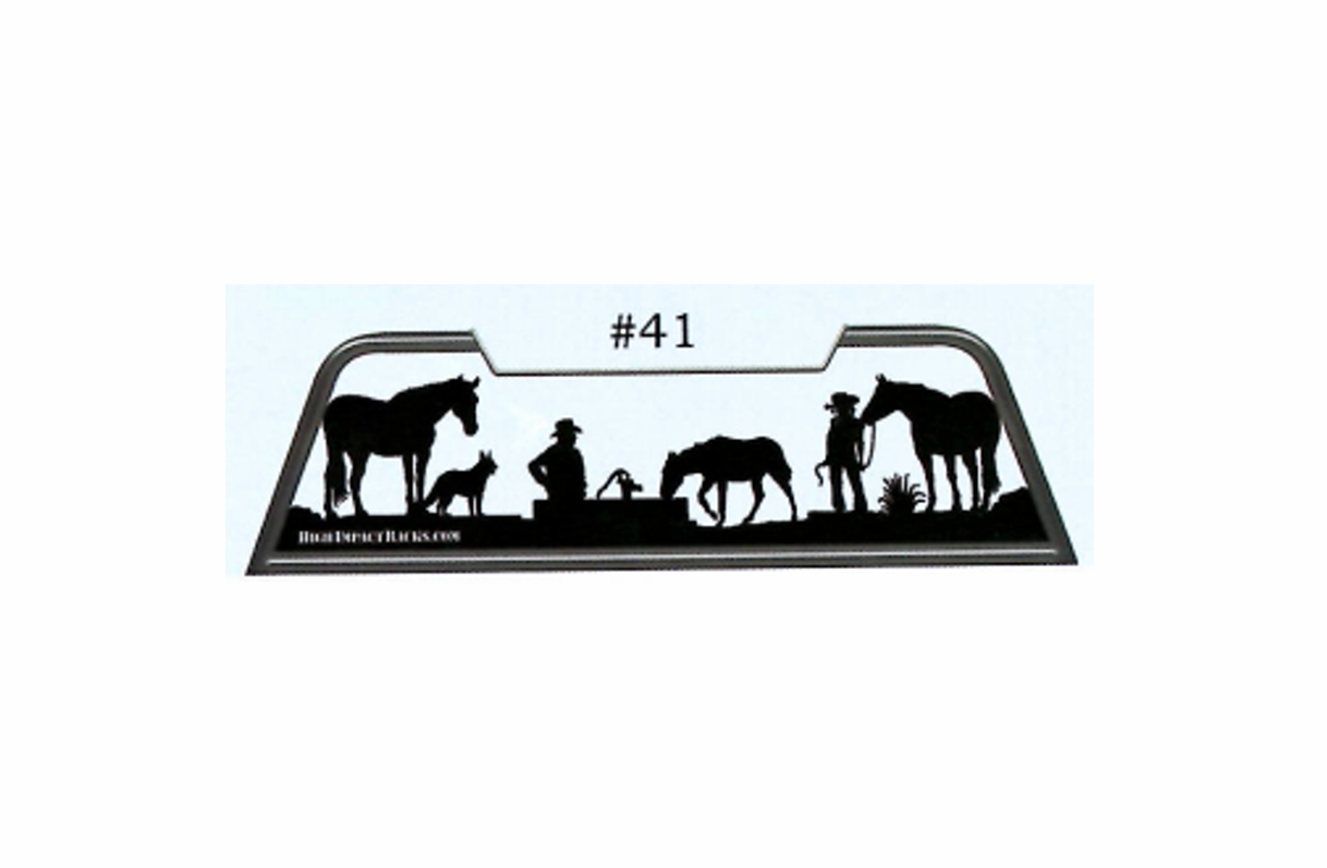 Embrace the simplicity and beauty of ranch life with our Ranch Watering Hole #041 back window rack. Precision-cut from 1/8″ steel and framed with 1 1/2″ tubing, this design captures a peaceful moment on the ranch, featuring a cowboy and his loyal dog near a watering trough, with horses calmly drinking and a ranch hand…