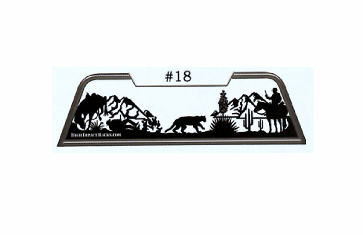 Embrace the untamed beauty of the frontier with our Wild West #018 back window rack. Constructed from 1/8″ steel and reinforced with 1 1/2″ tubing, this design features a striking desert scene with a cowboy on horseback, towering mountains, rugged cacti, and a prowling cougar in the foreground. Perfect for those who love the adventurous spirit of the West, this rack adds a bold, rugged touch to any truck, making a statement of strength and wilderness.